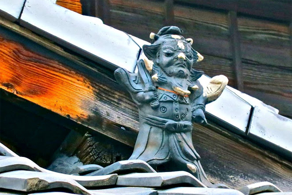 I found this guy perched on one roof whilst wandering around my neighbourhood of Nishijin. He is a Shoki-san: a full-bellied, sword-wielding demon-queller god originating from Tang China. Shoki figures are particularly unique to Kyoto. It is said the custom of placing Shoki-san on roofs started in the Edo Period. The story goes that a new house was built in Sanjo St. with an onigawara roof tile, which was believed to have driven evil spirits over the house opposite, causing the master’s wife to fall ill. Having tried all medicines available, the master of the house pleaded with his neighbour to take down the roof tile. His request was rejected, but upon learning of the legend of Shoki had his figurine made and placed it on his roof to face the onigawara. Of course, the story ends happily, and his wife recovers.